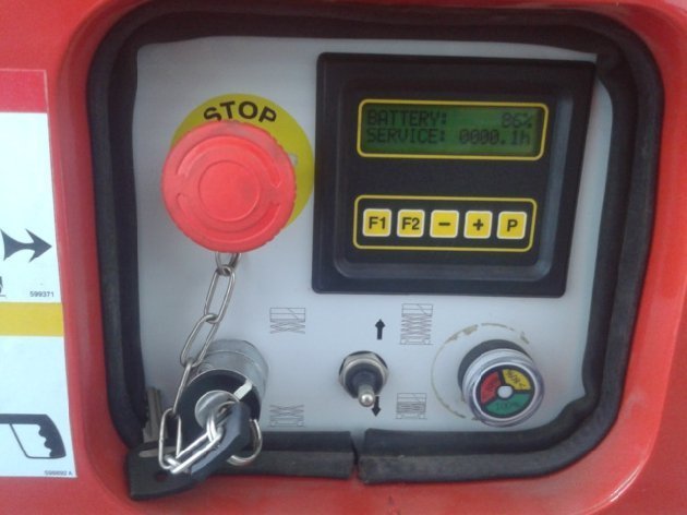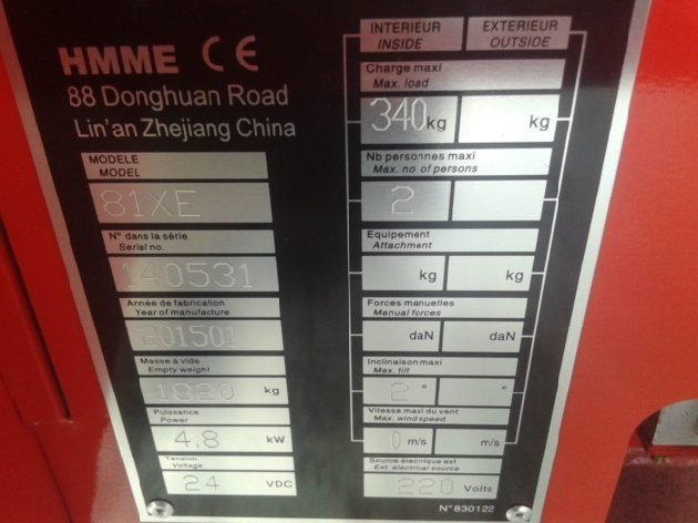 Details Feux de travail, Feux à éclat, PPS no Marking Limiteur de charge Prise 220V Nacelle ciseau capacité 3 personnes, 340 kgs ou 120kgs sur l'extension. Utilisation en extérieur avec du vent jusqu'à 45km/h longueur totale: 2.47 m Hauteur de la plateforme en extension totale : 6.10m dimensions plateforme : 0.80x2.30m , extension de 1m hauteur de travail: 8.10m vitesse de déplacement : 4.0 km/h hauteur abaissé: 2. 14m et avec les barrières baissées : 1,92m